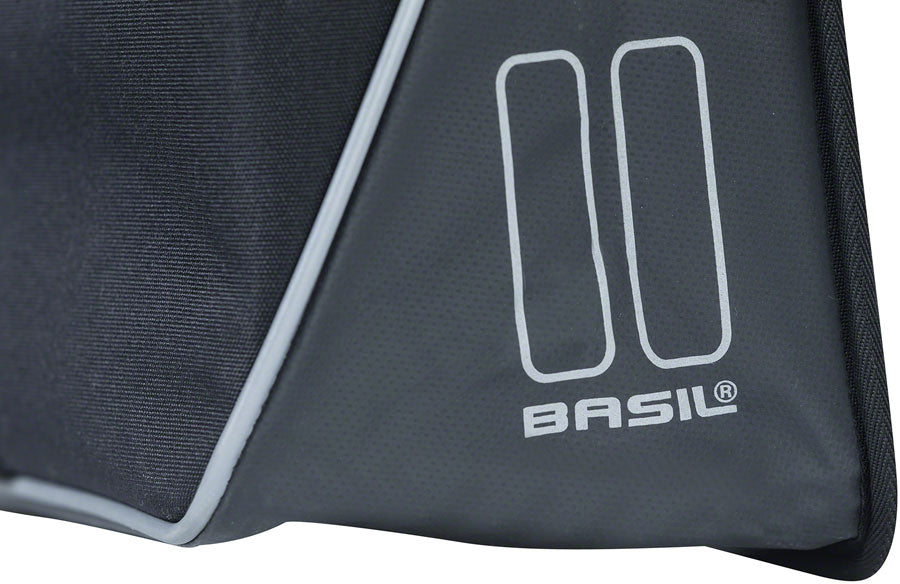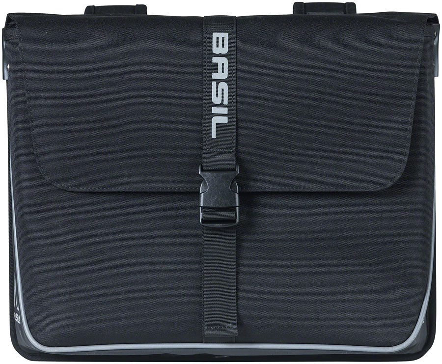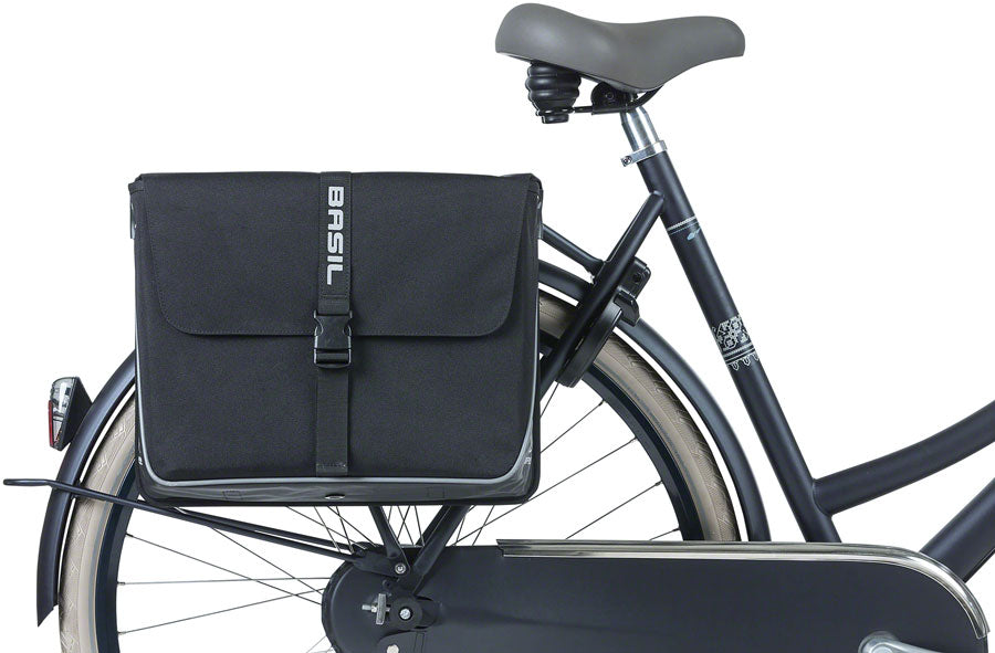 The Basil Forte Double bag is a practical double pannier in which you can carry a lot of groceries handy for when you want to get ingredients for the evening meal quickly after work. The bag is a strong multi-tasker in a contemporary style and is made of water-repellent polyester in combination with oilcloth. The bag also has an extra sturdy construction. The Forte Double Bag is equipped with a strap and adjustable closure. Thanks to the reflective accents on all sides and an extra-long reflective piping, you are more visible in the dark.
