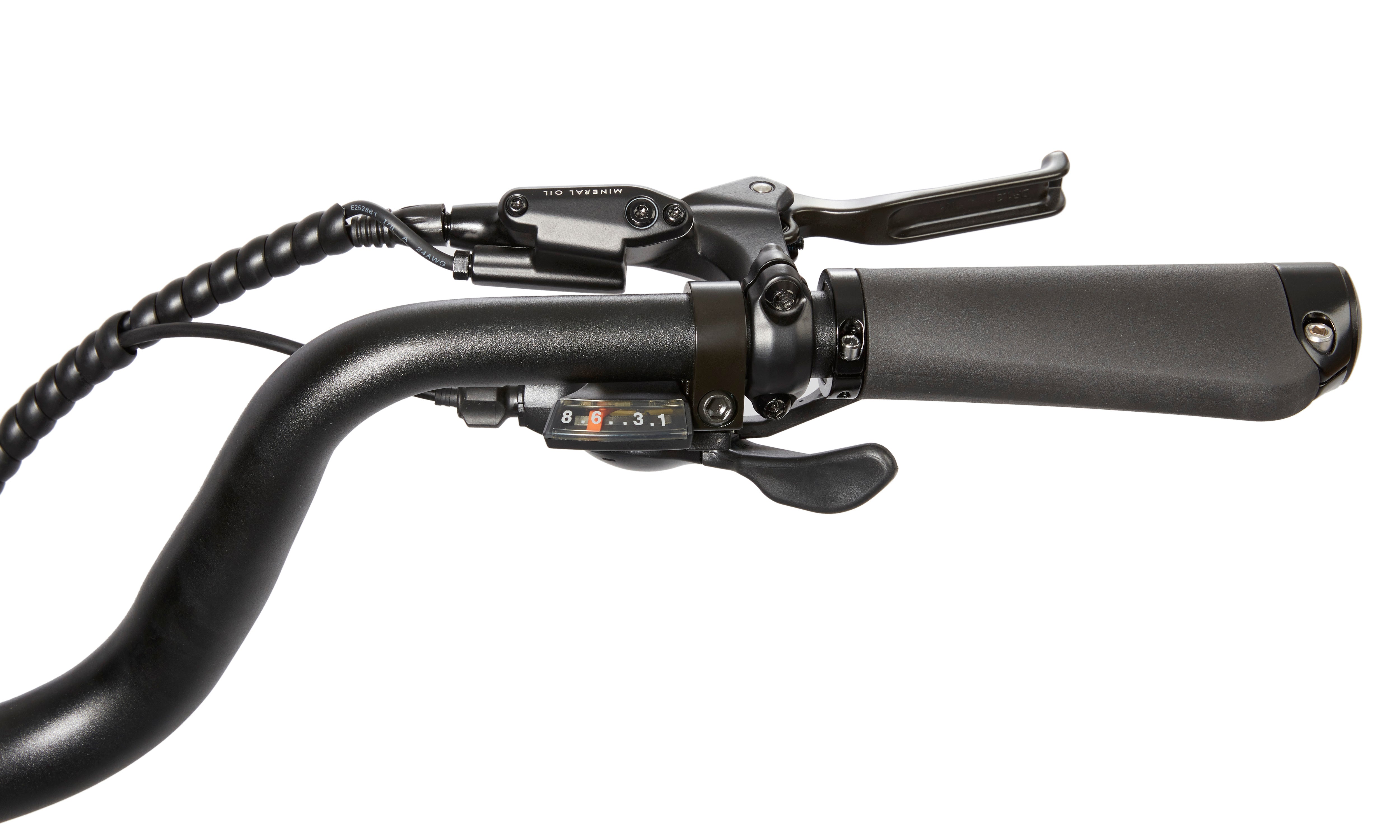 - Powerful Tektro hydraulic brakes with a motor cut-off switch and 180mm rotor for reliable stopping power